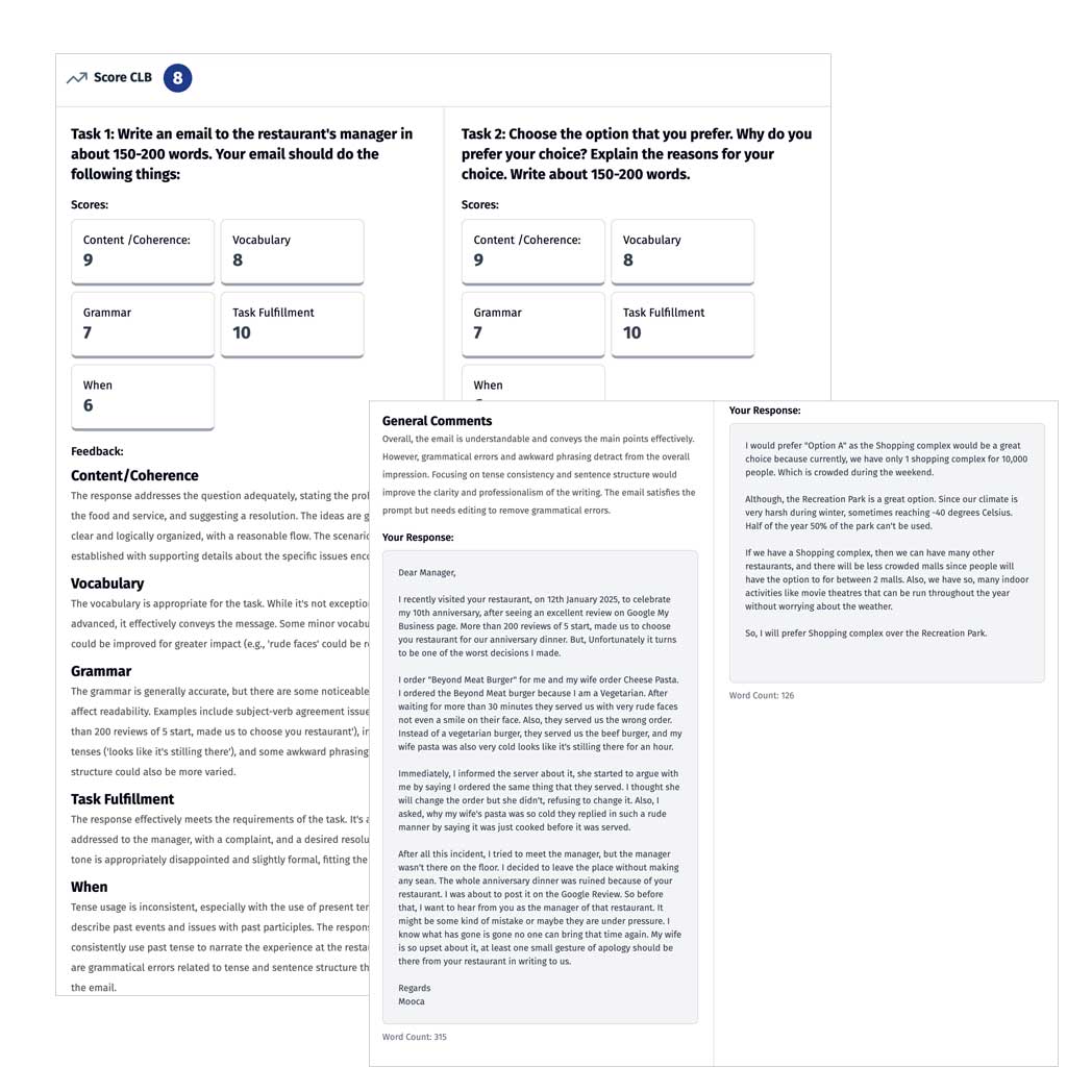 Get instant, detailed feedback that mirrors CELPIP’s official scoring system. Our AI evaluates your writing based on four key criteria——providing a score and breakdown to pinpoint your strengths.